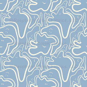 Whimsical hand drawn ghost faces on a pastel light blue background. Perfect for kids' rooms.