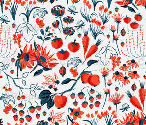 Garden plants and flowers, red and orange colors with blue on white background. No Ai art