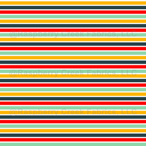 Coordinating linear design features horizontal stripes for the Garden Cheer Collection. Mint Green, Golden Yellow, Bright Cheery Red, Dark Teal, and White. Spring, Summer