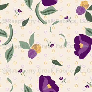 Garden Dream Floral Purple, Scattered purple flowers on cream background with soft green leaves and small dots, purple and yellow roses, scattered layout, multidirectional layout, romantic feminine floral pattern, purple and lavender tones