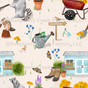 Garden, gardening, spring, animals, kids, frog, chipmunk, butterfly, whimsical, tan, flowers