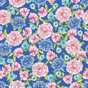 Pretty floral pink and blue roses and peonies on a brightblue background.