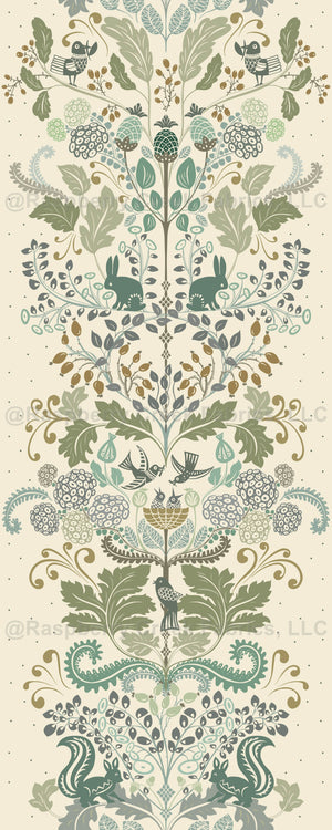 Garden Tales damask XL panel green shades flowers, damask, Garden, plants, animals, fruits, farmhouse, nature, paradies, orange, organic shapes, nature-inspired,