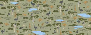 This design features Australian animals in the outback ready to welcome a baby into the world with a G'day little mate. There is plants, eucalyptus trees and watering holes as well as many different types of animals.
