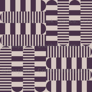 Geometric Cheater Quilt with broader stripes in halfround rectangles. Modern twist on classic squares – cheater quilt collection - eggplant purple white truffle cream – retro 70s blankets, kitchen towels, shopping bags, capes, jackets