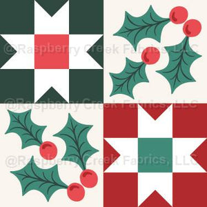 Geometric Christmas Quilt Squares and Holly Leaves in Red Green