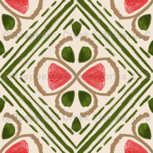Painterly gouache geometric diamond with vertical leaves and horizontal red flowers in dark green on a beige background.