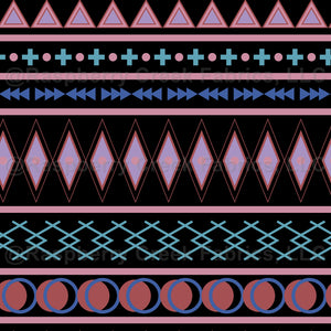 Geometric shapes in teal, red, blue, purple and pink, against a black background.