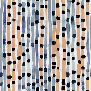 Whimsical and playful fabric design featuring vertical lines and dots in different shades of blue, gray, and peach. The lines are uneven and wavy, and the dots are scattered randomly throughout the image. The background is white, and the design has a modern and abstract feel. This fabric is ideal for adding some fun and texture to your projects.
