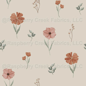 A delicate scatter of autumn florals in soft tones of rust, blush, and sage on a warm neutral stone background.