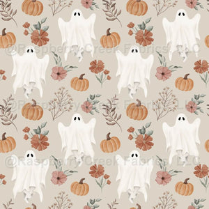 This playful Halloween print showcases soft white watercolor ghosts surrounded by pumpkins, rust-colored florals, and gentle greenery on a warm cream background. The light, neutral palette gives this design a sweet and cozy feel that works beautifully for both Halloween and general fall sewing. Perfect for children’s clothing, baby items, pajamas, dresses, and quilts, this seamless repeat pairs effortlessly with coordinating Ghostly Florals blenders for a cohesive seasonal look.