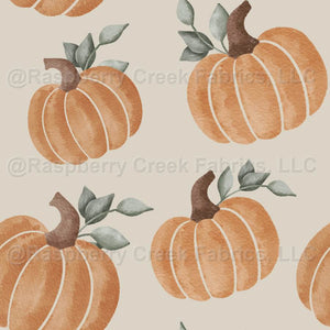 Rustic watercolor pumpkins with soft green leaves on a warm stone background. A perfect statement piece for fall fashion or decor.