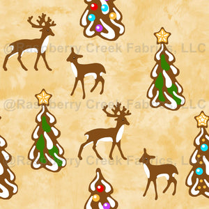 Gingerbread trees, bucks, and does create a delightful design for Christmas and winter on a frosted gold background.
