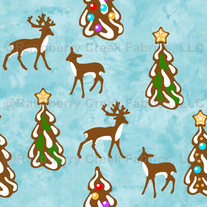 Gingerbread trees, bucks, and does create a delightful design for Christmas and winter on an ice blue background.