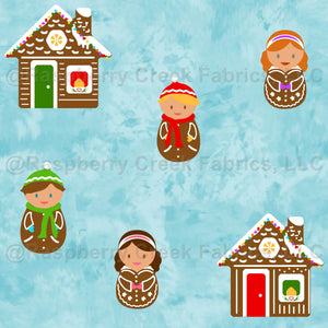 Cute little gingerbread houses and people create a delightful design for Christmas and winter on an ice blue background.
