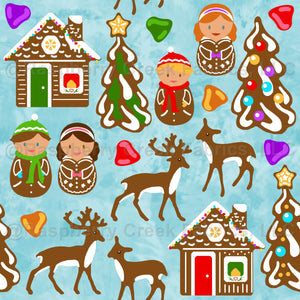 This design puts everything together in one repeat: gingerbread houses and people, Christmas trees, deer, and sugarplums on an ice blue background.