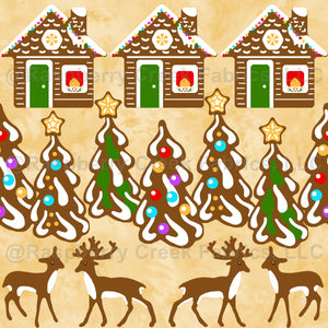 Rows of gingerbread houses alternate with Christmas trees and deer on a frosted gold background.