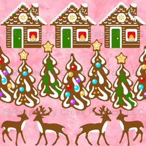 Rows of gingerbread houses alternate with Christmas trees and deer on pink.