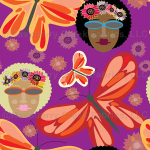 Female faces wearing sunglasses and flowers in hair with butterflies on purple background.