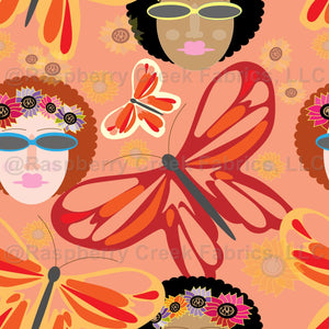 Girl faces wearing sunglasses and flowers in hair with butterflies on a peach background.