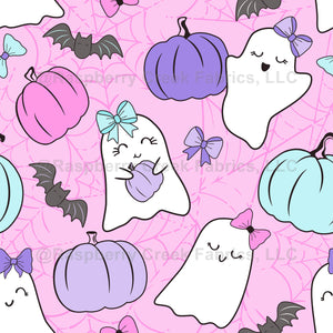 Girly Ghost Halloween Pink. Adorable girl ghosts with bows, pumpkins, bats and spider webs.
