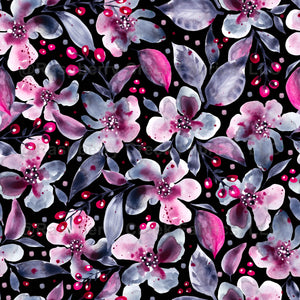 Boho Blooms in Pink, Magenta and Gray Watercolor Floral on black with berries and botanicals. Large scale. Fabric, Home Decor, Interior Design.