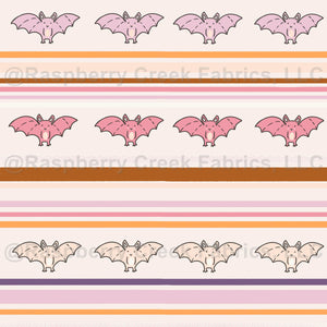 A fun halloween stripe featuring cute bats and pops of color. In purple, pink, orange, cream, blush, and brown.