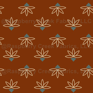 A simple geometric fleur motif in warm golden lines set against a rich rustic chestnut background. This small-scale coordinate brings a refined, heritage look that pairs beautifully with fall collections. Part of the Pleasant Pheasants Collection.
