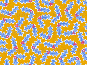 A fun and modern take on Christmas Holly. A golden yellow background with periwinkle blue leaves and raspberry red berries.