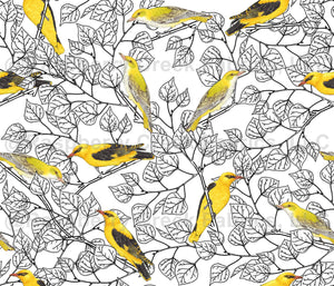 A black and white wood with many golden oriole hand painted with watercolor. Mid scale