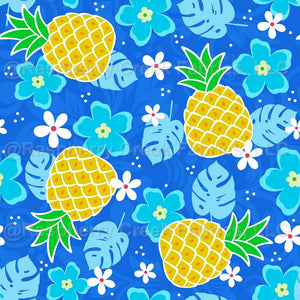 Golden Yellow Pineapples Tropical Leaves and Flowers on Blue