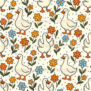Goose Meadow Floral White Geese and Flowers on Ivory