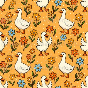 Goose Meadow Floral White Geese and Flowers on Marigold Yellow