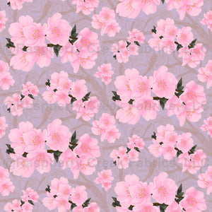 Gouache Cherry Blossoms on textural background with tree branches on a light purple background