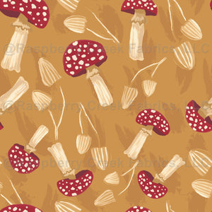 Gouache wild mushrooms tossed pattern with red mushrooms and beige mushrooms with brush strokes in a light brown/mustard color background.