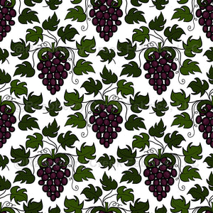 Grape clusters in deep magenta with green leaves and scrolling vines on a white background. Art deco, art nouveau, harvest, fruit, food, kitchen, garden, farmer, Italian, French, fabric, home decor. Medium Scale, directional