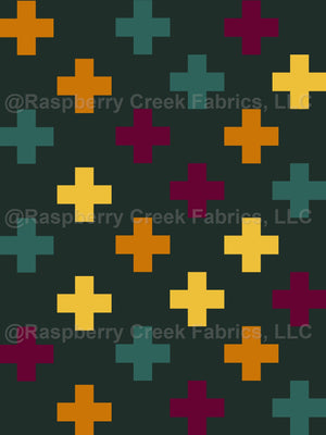 Green, orange, yellow and burgundy crosses, against a dark green background.