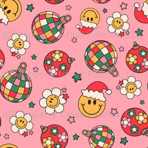 Groovy Christmas Happy Santa Faces Smiling Daisies and Retro Disco Ball Ornaments on Pink