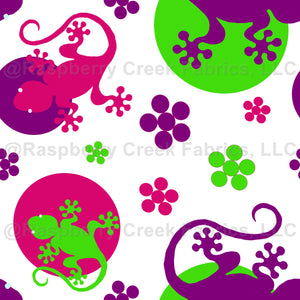 Groovy Geckos - Purple Green and Pink Reptiles on colored dots surrounded by retro colored flowers
