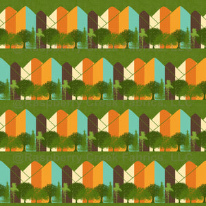 Bold mountains in a classic 70's palette are the backdrop for avocado green tree silhouettes.