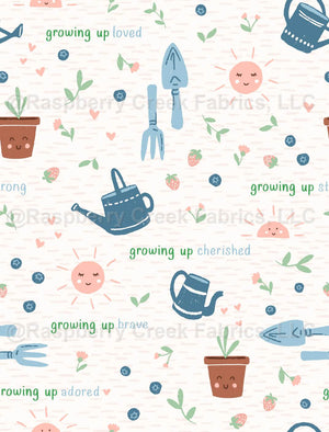 Grown with Love gardening fabric for kids with textured background, gardening tools, flowers, berries