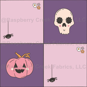 Fun checkered pattern in shades of purple, featuring skulls, pumpkins, and a spider on its web.