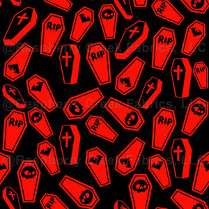 Halloween gothic coffin with bat, cross, R.I.P. and skull motifs.