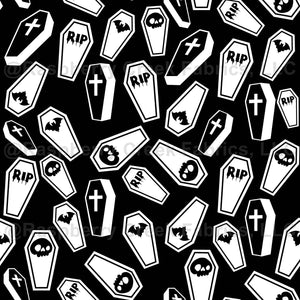 Halloween gothic coffin with bat, cross, R.I.P. and skull motifs. Black and white.