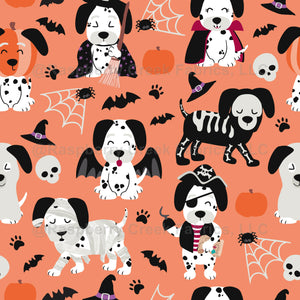 Halloween Costume Dogs Orange. Black and white dalmatian dogs in Halloween costumes. Witch, vampire, pirate, skeleton, bat, ghost.