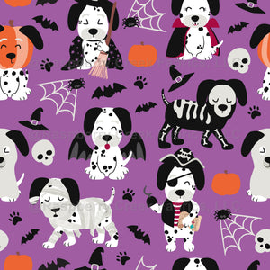 Halloween Costume Dogs Purple. Black and white dalmatian dogs in Halloween costumes. Witch, vampire, pirate, skeleton, bat, ghost.