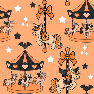 Creepy carousel with pony and unicorn carousel horse Halloween carnival theme. Bats, bows and stars. The merry go round is now a scary go round!