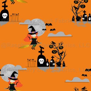 Witch flying on a broom over graveyard a spooky cute halloween fabric for kids