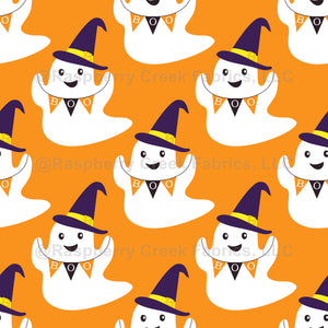 Cute, fun and adorable pattern with white ghosts on orange background. Modern and trendy gift, perfect for Halloween.