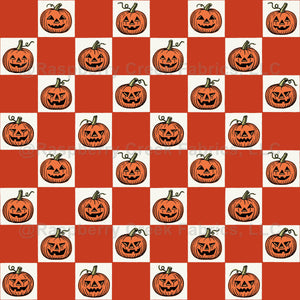 Carved Orange Pumpkins on Warm Red Checkerboard.